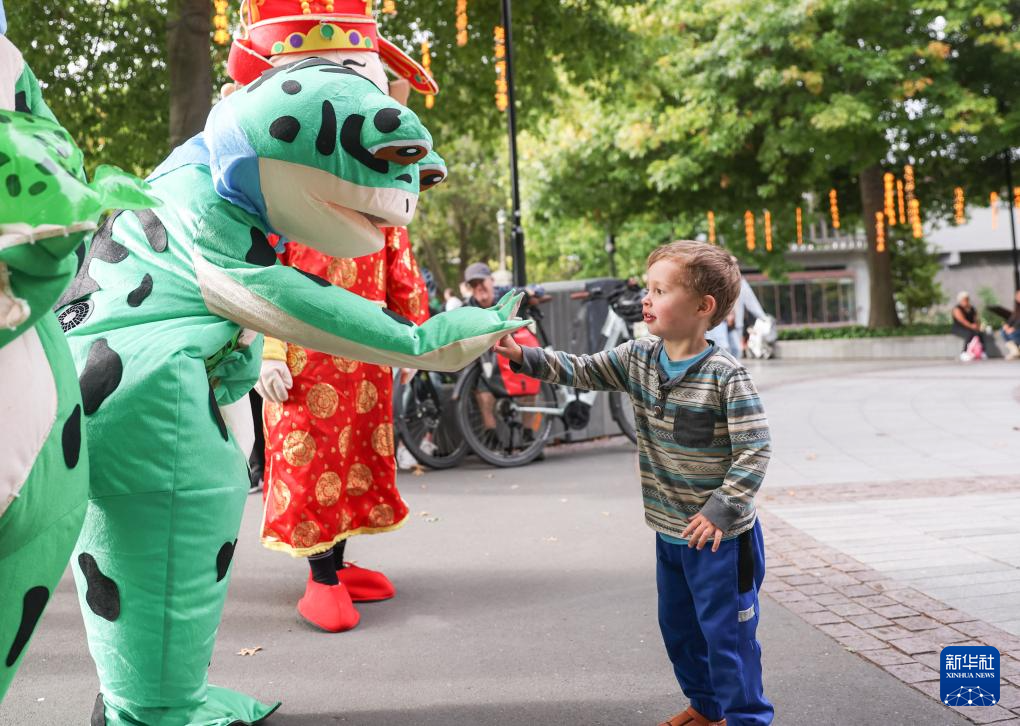 2月7日,小朋友在新西蘭克賴斯特徹奇新春嘉年華活動上與1對1教學青蛙人偶互動。